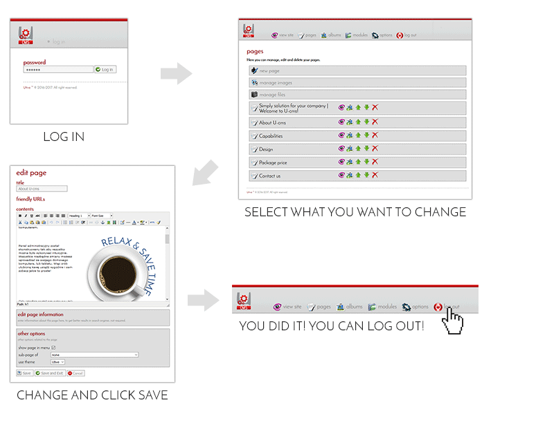 U-cms is a simple solution for anyone looking to create an easy to use and navigate website. Our U-cms system was build in such a way that everyone, no matter what your computer literacy level is, can operate it without a problem.